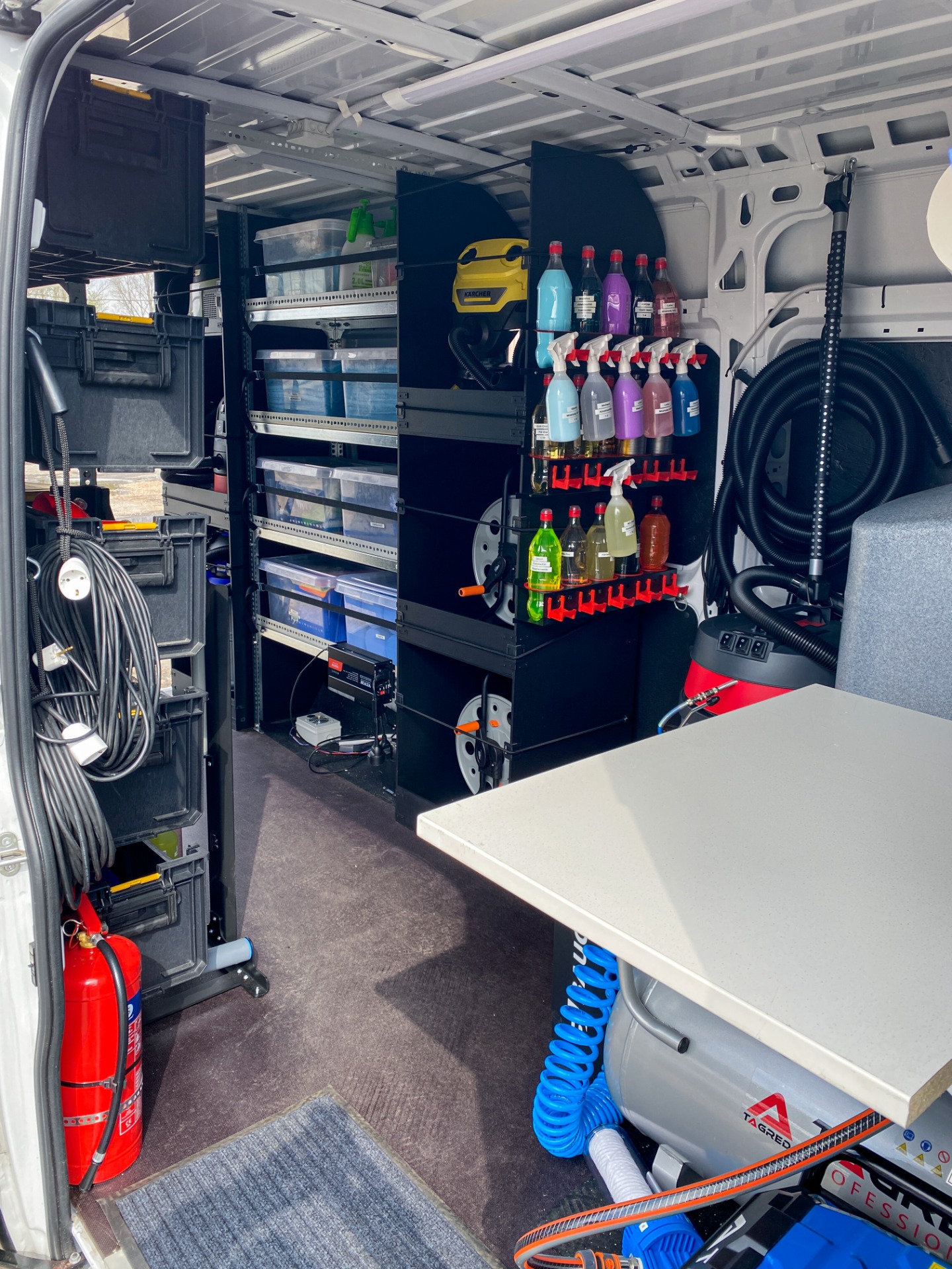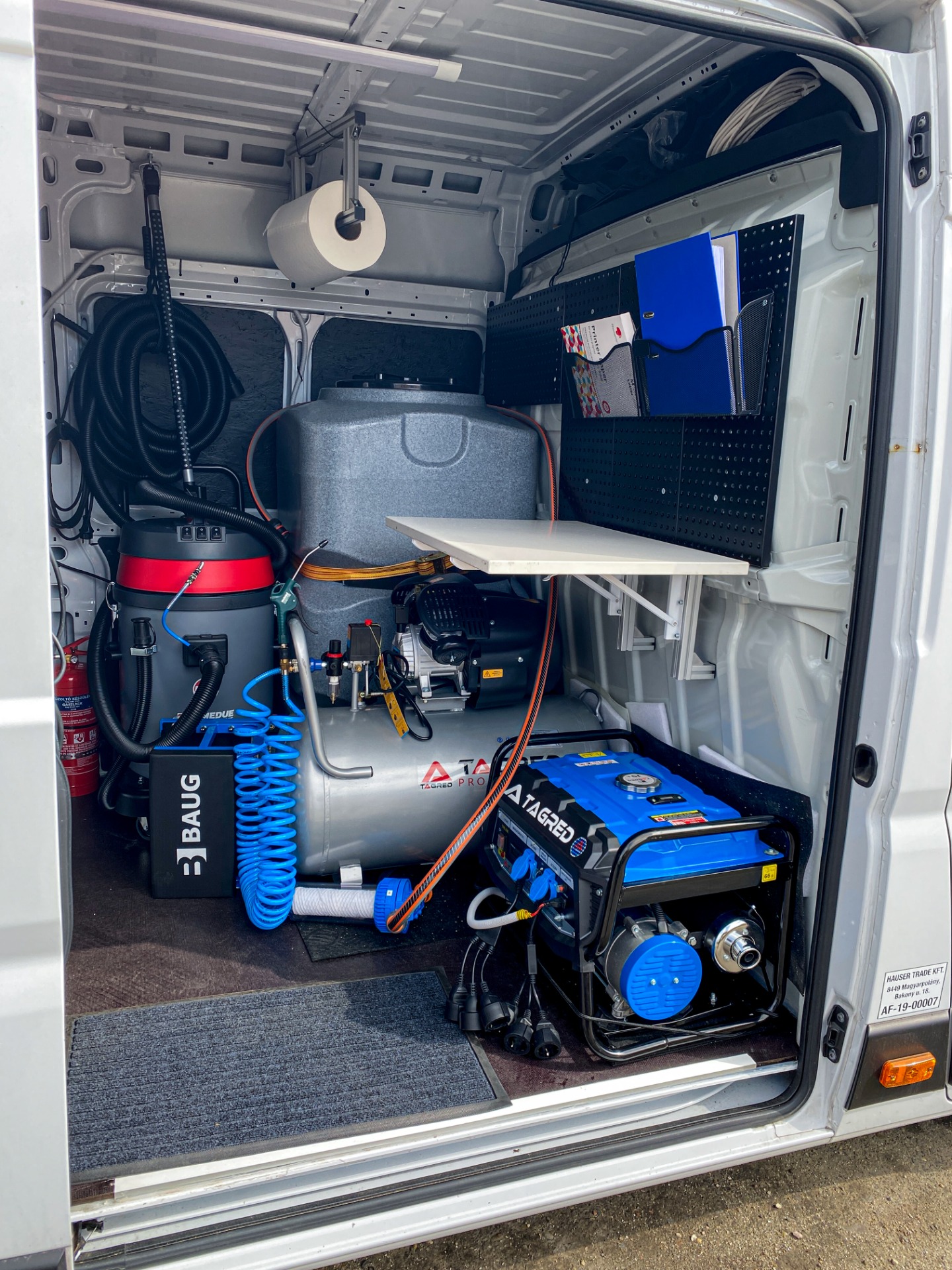 Miként az említésre került, munkaeszközöm egy Fiat Ducato kisteherautó, mely átalakításra és felszerelésre került lminden szükséges munkaeszközzel és ipari tisztítógéppel. A teherautó tágassága lehetővé teszi azt, hogy minden szolgáltatást a lehető legalaposabban meg tudjak csinálni, hisz egy mobilműhelyként funkcionál, s ekként bármely helyszínen valamennyi olyan gép és felszerelés a rendelkezésemre áll {Pl.: 2db (Flex, Karcher) ipari porszívó; 2db ipari kárpittisztító; Karcher magasnyomású mosó; (Karcher) gőztisztító; ózongenerátor; (Flex, Rupes) polírozó gépek; (Tagred) 100L kompresszor;(Tagred) 3,5kw aggregátor; 500L víztartály...etc.}, mely lehetővé teszi azt, hogy a lehető legmegfelelőbb munkát tudjam elvégezni.